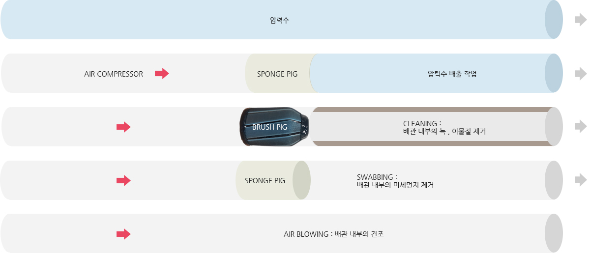 그리고 HYDRO TEST후의 잔여 물을 빠른 시간내에 제거하기 위해서도 PIG CLEANING 공법을 이용하기도 합니다.